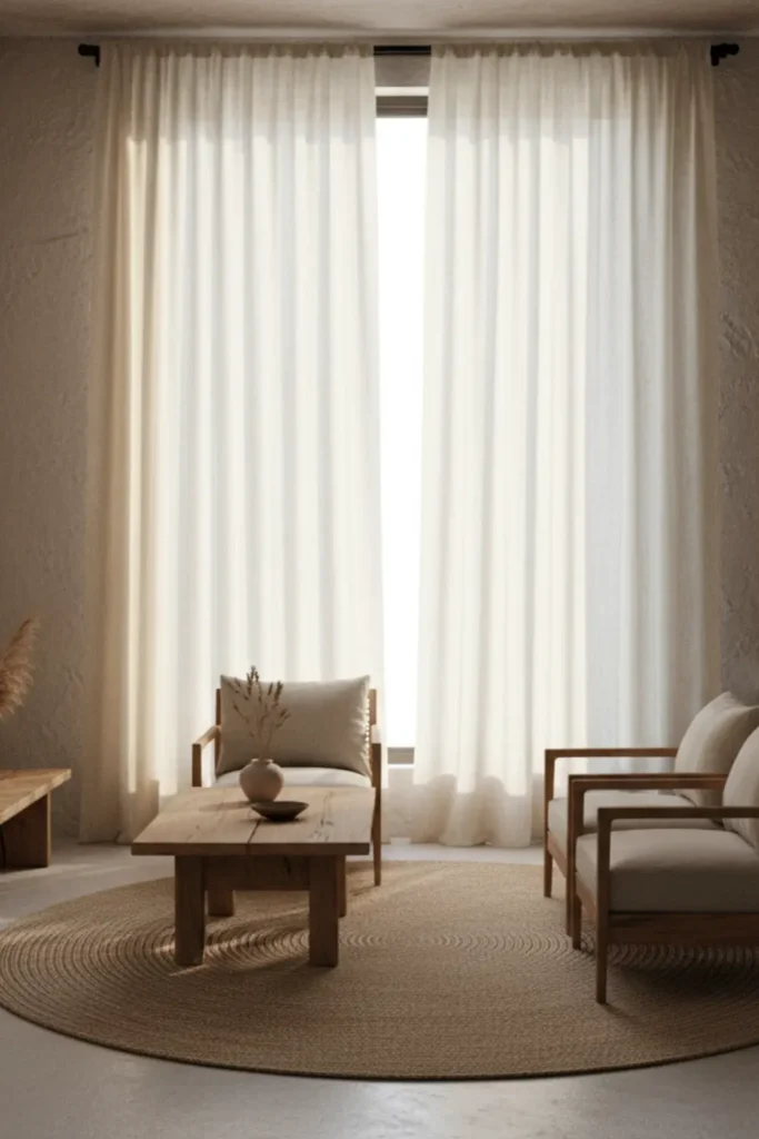 Wabi Sabi rooms glow softly with daylight. Instead of harsh overhead bulbs, they rely on the shifting beauty of natural light. Sheer curtains, open windows, and pale walls invite sunlight to move gently across the space throughout the day.