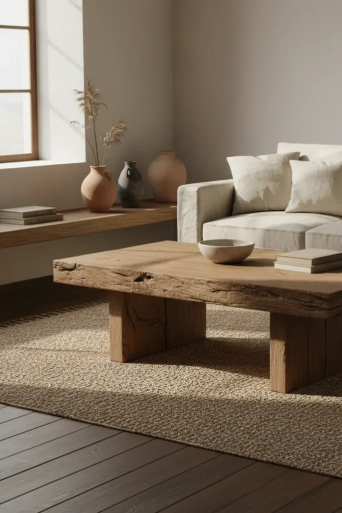 In your living room, skip the glossy finishes and choose textures that invite your hands to linger. A raw oak coffee table, a linen slipcover, or a jute rug brings a soft, grounded energy. Every scuff, grain, and imperfection adds warmth rather than distraction.